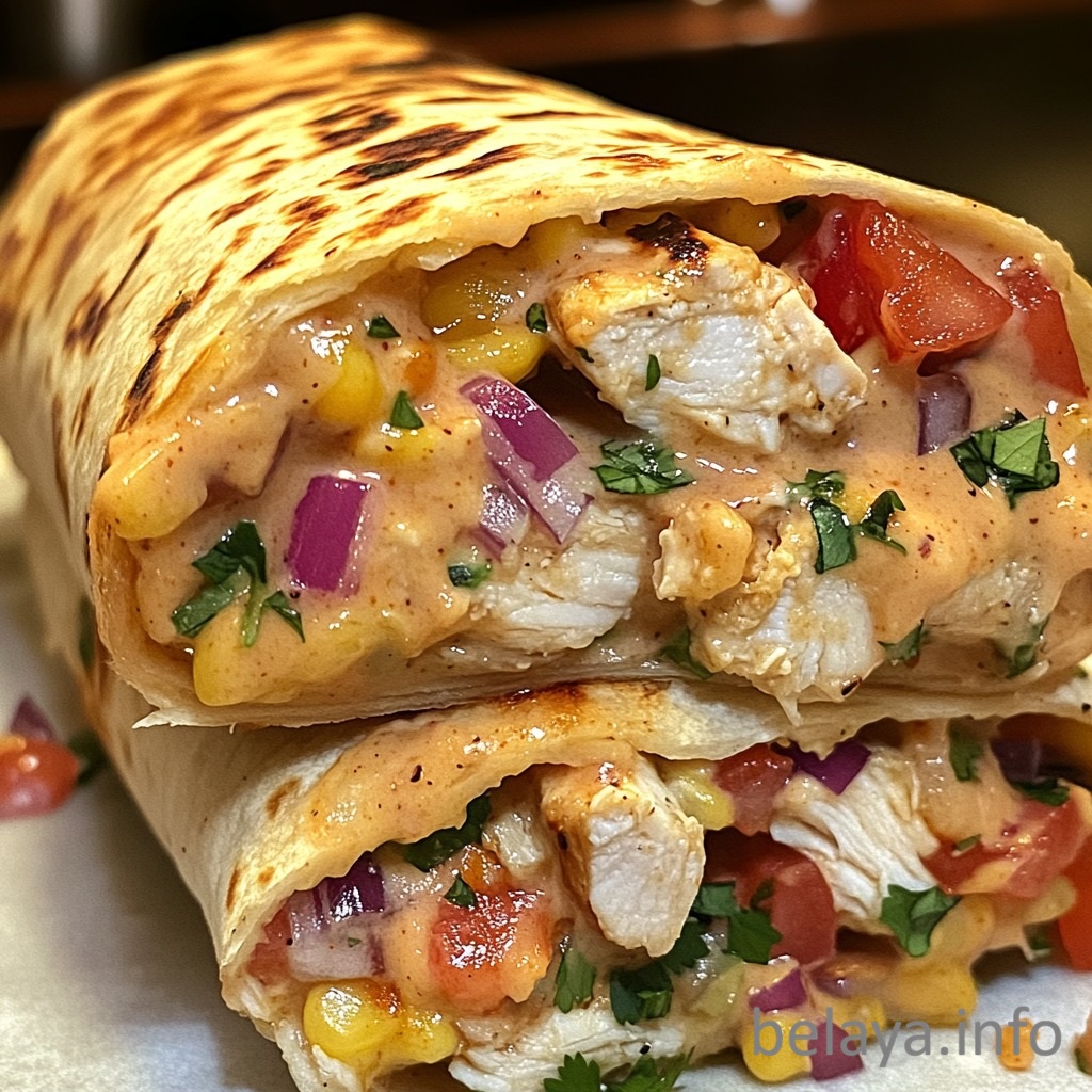 Perfect harmony of textures – soft tortilla, juicy chicken, crisp vegetables, creamy sauce, and melty cheese create a layered, satisfying eating experience