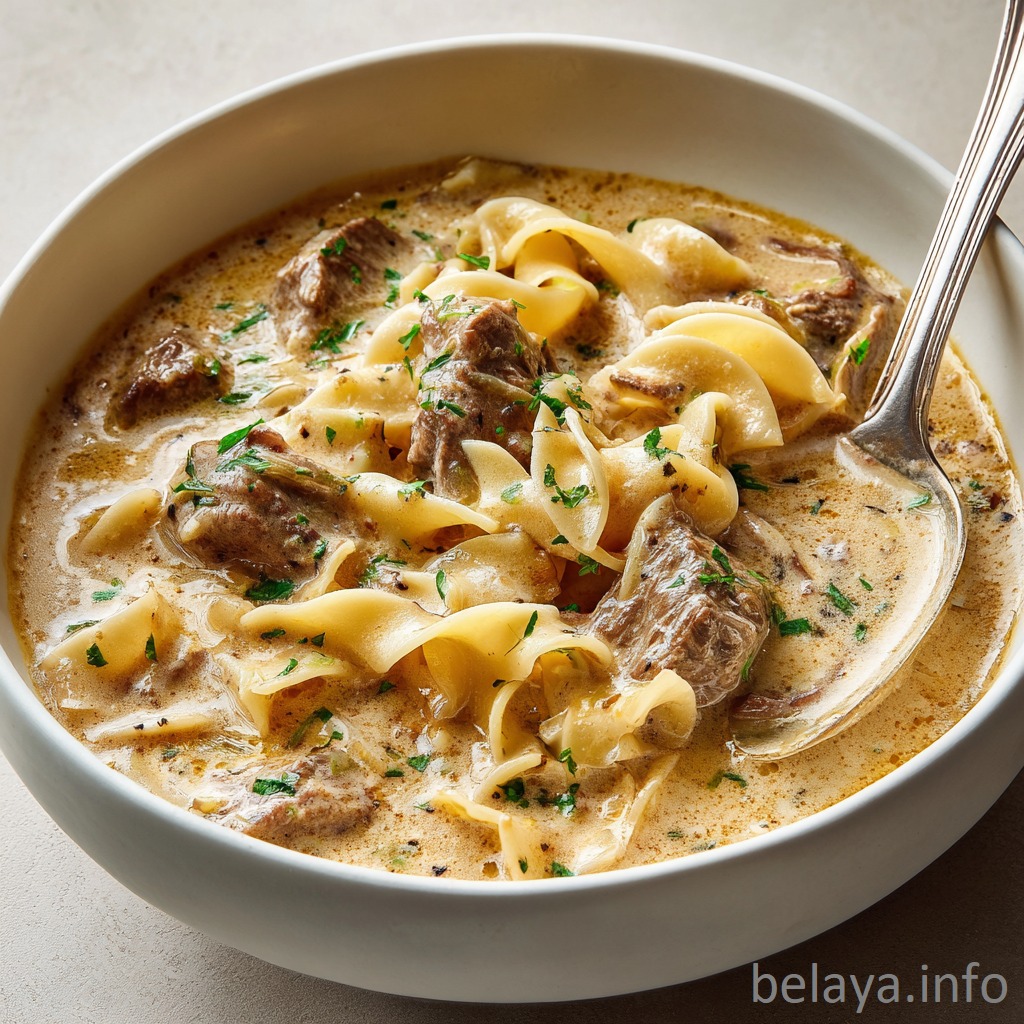 Once the sour cream is stirred in and the beef is returned to the pot, let the soup rest for 3–5 minutes off the heat. This allows the flavors to settle, the sour cream to fully integrate, and the broth to thicken slightly for a more luxurious texture.