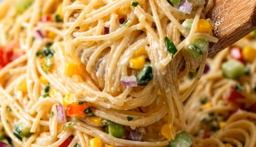 Every forkful brings a lively mix of crunchy vegetables, tender pasta, and creamy dressing — a dish that’s as fun to look at as it is to eat.