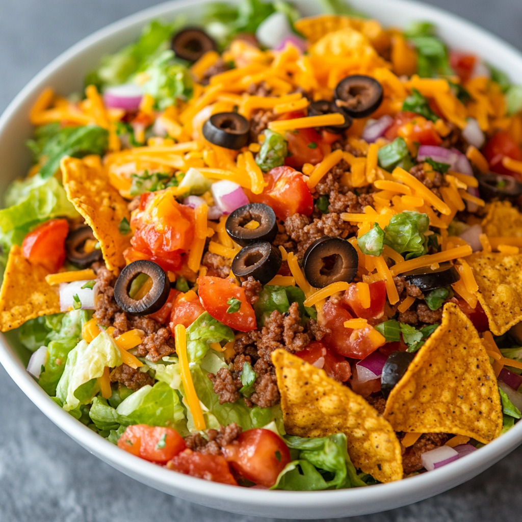 For the perfect texture, combine all the ingredients just before eating — that way, the Doritos stay crisp instead of getting soggy. Toss everything lightly to coat with the creamy dressing and taco-seasoned beef.