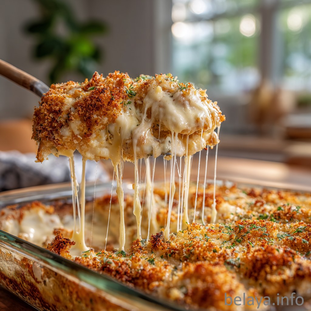 Tender chicken breasts are seasoned to perfection, blanketed in creamy layers of provolone, sour cream, and Parmesan, then crowned with buttery cracker crumbs that bake into a golden, irresistible crust.