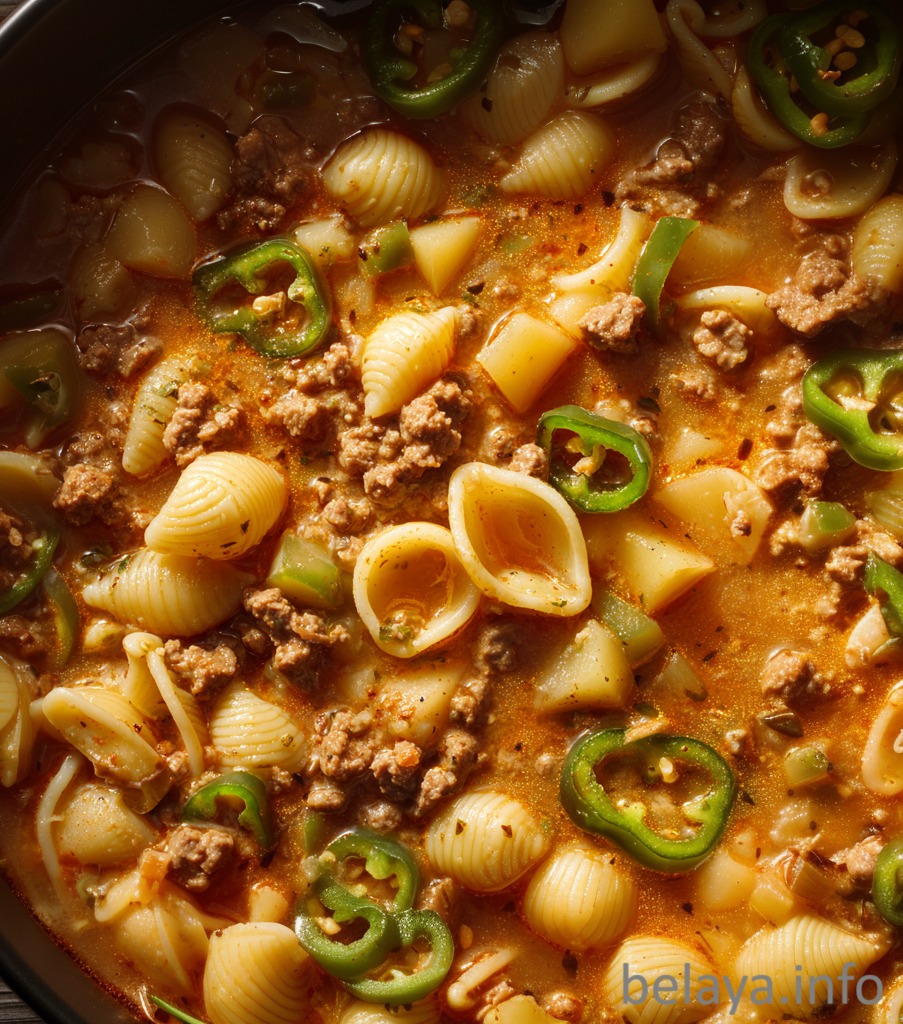Comforting and Hearty: This dish combines the savory richness of ground beef, tender potatoes, and pasta shells in a warm, flavorful sauce. It’s the ultimate comfort food, satisfying both hunger and cravings for something hearty and comforting.