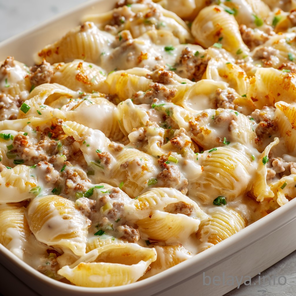 Savory ground beef, tender pasta shells, and bold taco seasoning simmer together in a rich, flavorful sauce, then finish with a swirl of creamy queso that ties everything together.