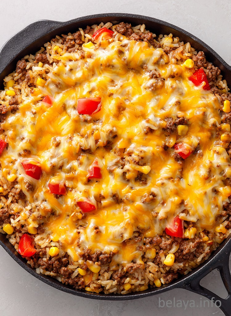 Juicy ground beef, fragrant spices, tender rice, and sweet corn simmer together in a rich blend of salsa and tomato sauce, creating a dish that’s hearty yet vibrant. Topped with melted Mexican cheese, it captures the soul of a classic Tex-Mex dinner while keeping things simple enough for a busy weeknight.