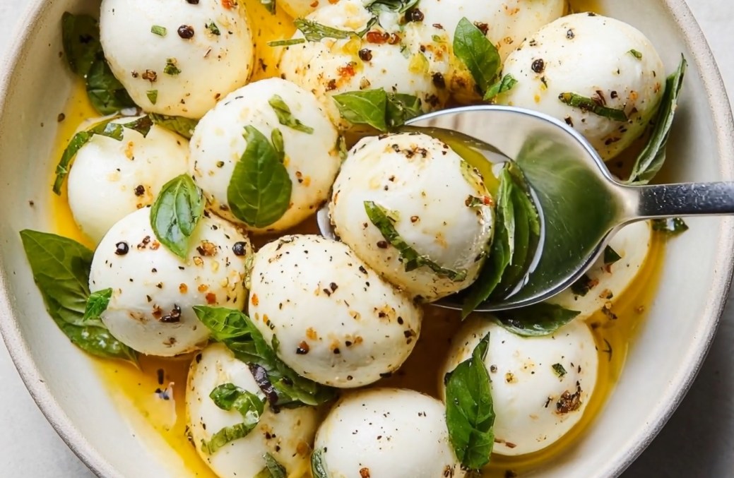 Gently place the mozzarella balls into the marinade and toss until evenly coated.