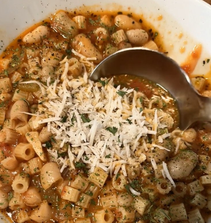 Pasta e Fagioli shines when served at a comfortable warmth rather than piping hot — this allows you to fully taste the subtle sweetness of the tomato, the creaminess of the beans, and the gentle heat from the pepper flakes.