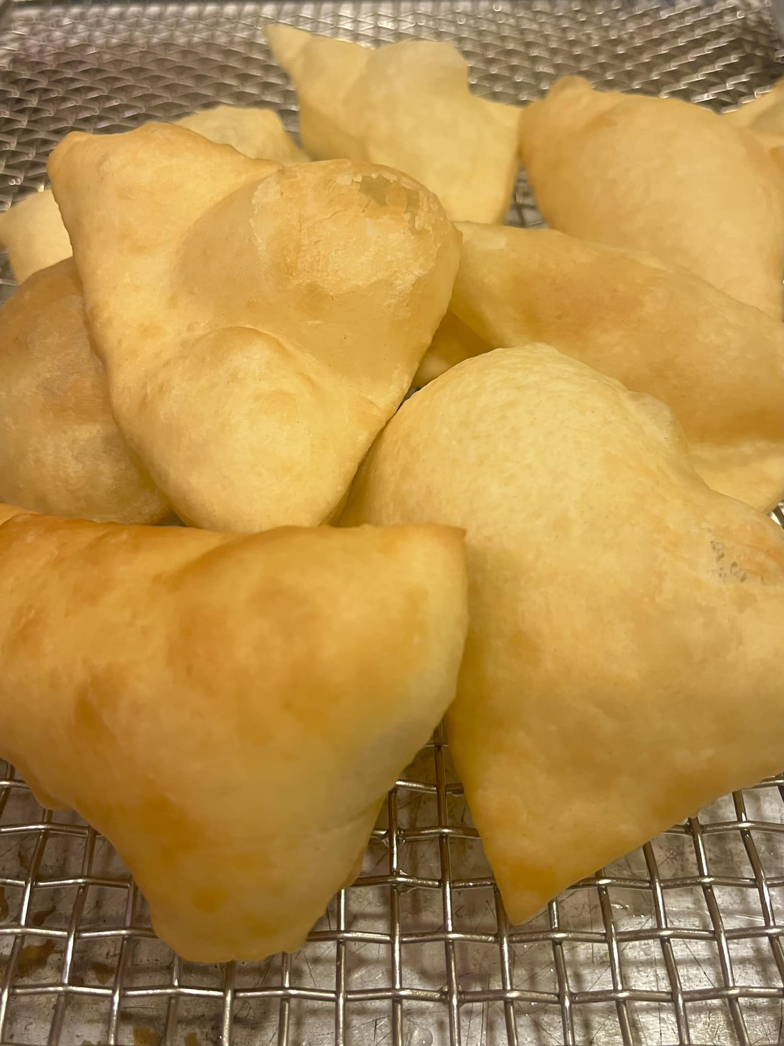 Working in batches, carefully add dough squares to the oil. (Don’t overcrowd the pot.) Fry, turning as needed, until golden brown on both sides and puffed for about 1 to 2 minutes. (If your dough isn’t puffing in the oil, gently tap them with your strainer to quickly submerge them in the hot oil.