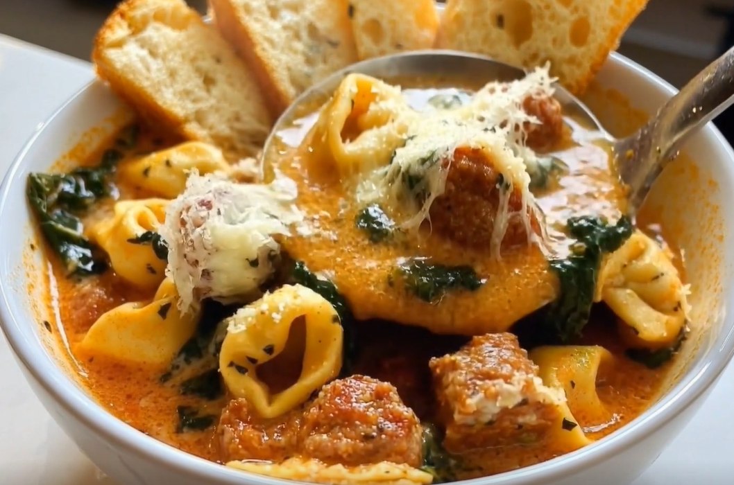 Tender cheese-filled tortelloni simmer in a savory broth infused with sweet Italian sausage, garlic, and basil, while fresh spinach adds color and balance. Every spoonful offers layers of flavor — creamy, tangy, and perfectly seasoned — that make it feel like a rustic Italian meal made with love.