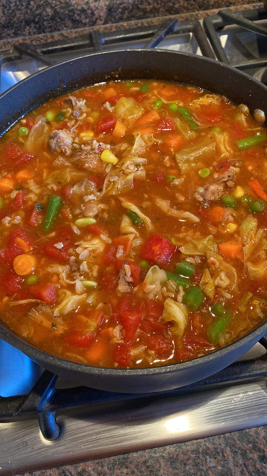 It’s packed with vegetables including onions, carrots, celery, and potatoes, along with green beans, corn, and peas for added texture and flavor.